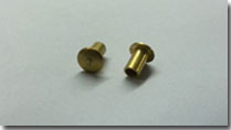 | Semi-tubular rivets (also known as tubular rivets) are similar to solid rivets, except they have a partial hole (opposite the head) at the tip. The purpose of this hole is to reduce the amount of force needed for application by rolling the tubular portion outward. The force needed to apply a semi-tubular rivet is about 1/4 of the amount needed to apply a solid rivet. Tubular rivets can also be used as pivot points (a joint where movement is preferred) since the swelling of the rivet is only at the tail. Solid rivets expand radially and generally fill the hole limiting movement. The finished look of a tubular rivet will have a head on one side, with a rolled over and exposed shallow blind hole on the other. Semi-tubular rivets are the fastest way to rivet in mass production but require a capital investment. |
